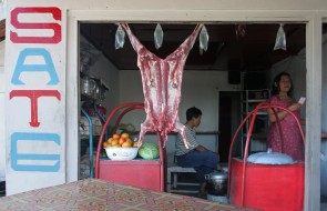 Takhle se tu večeří, hezky venku na zemi. Hlavně Saté, Nasi Goreng (rýže na všechny variace) a Bakso (polévka s masovými knedlíčky) a Mie Ayam (nudle s kuřetem).