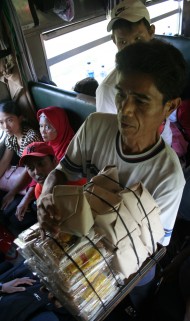 Letadlem do Jakarty, hlavního města. Strávili jsme tam den a pomalu vstřebávali ten rozdíl od Singlu. Motorky, odpadky a lidé jsou všude. Měl jsem o Jakartě teda jinej obrázek, možná přístav a spousta zboží. Je to ale směs mrakodrapů obehnaných plotem a mezi jsou slumy a silnice. Času bylo málo, tak jsme večer skočili na vlak. Třída Economi byla jasné volba. Žádná rezervace, ale nakonec jsme seděli i na sedačce. Přeci si nebudeme kupovat Business (400,000Rp) nebo i dražší, když můžem jet na 35,000Rp. Jak vidíte, byli jsme milionáři. 1,5 milionu rupií v kapse dělá docela bouli. (kurz je 1,000Rp - 1,7Czk). Takže vlak boží. Lidi i odpadky všude. Do toho pořád někdo něco prodával. Jídlo, pití, cigarety...