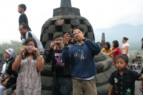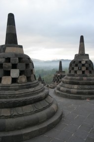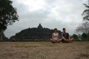 Po deseti hodinách jízdy, Yogyakarta. Poměrně staré město, které bylo sídlem Sultána. Dnes super místo pro turisty. Palác, podzemní mešita, batikované věci. Pro nás rychlovka, odpoledne do vesnice Borobudur. Spali jsme v policejních kasárnách, což měl být podle Lonely Planet hostel. OK. No a ráno za svítání na samotný chrám Borobudur. Ohromná budhistická mantra (118 x 118m), postavená v letech 750-850 našeho letopočtu Sailendra dynastií. Pak upadl v zapomění, objeven 1815, rekonstruován 1973/83. Protože byly akorát v indonésii prázdniny a slavila se Hari Raja,